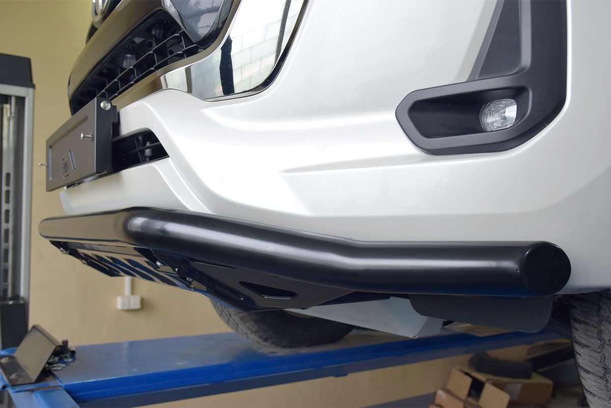 Новый передний бампер РИФ для Toyota Hilux 2020 – это не просто защита штатного бампера, а уникальная силовая конструкция, являющаяся одновременно и полноценным силовым бампером с интегрированной защитой радиатора! Защита радиатора тяг выполняет важную роль в усилении конструкции, поэтому она и является частью бампера.