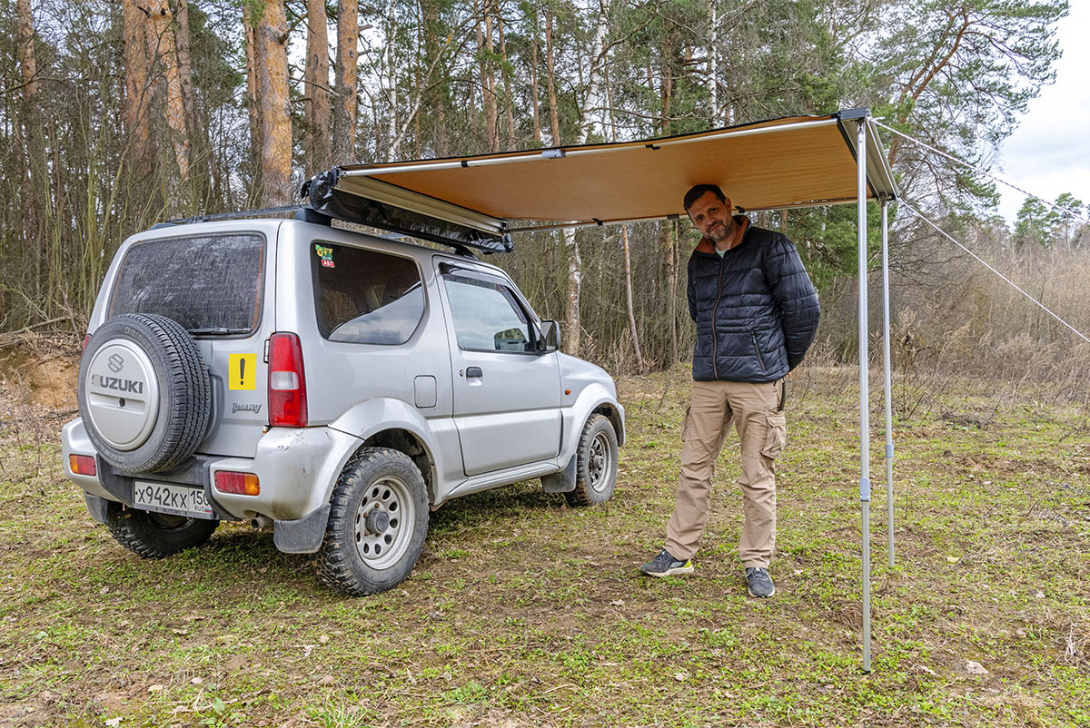 Такой тент позволяет с комфортом разместить рядом с автомобилем трёх-четырёх человек.